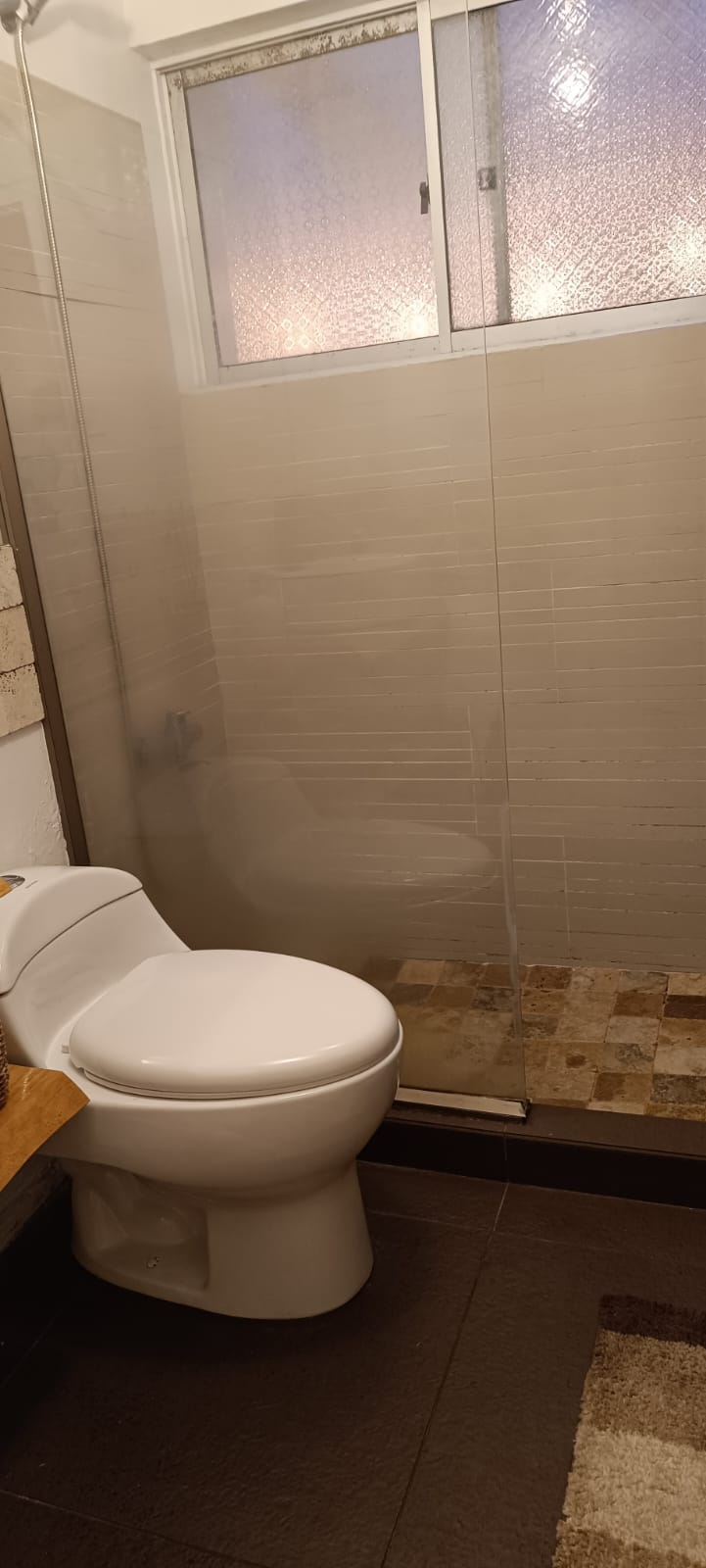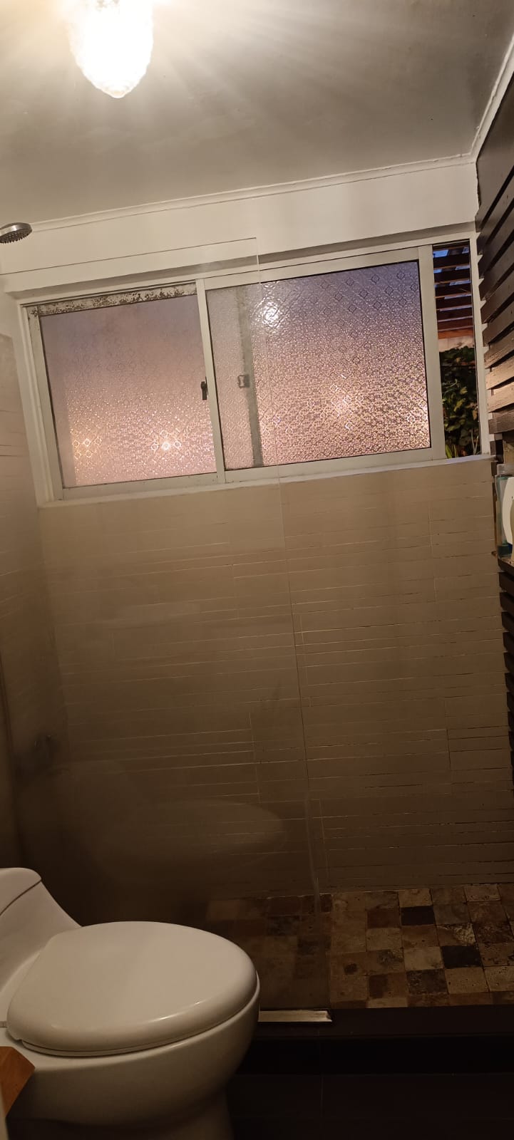 • Baño con piso y muro cerámico, con receptáculo y ventana